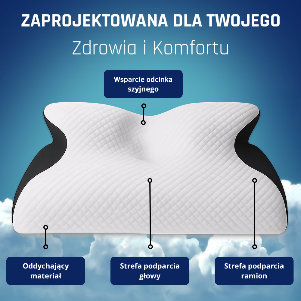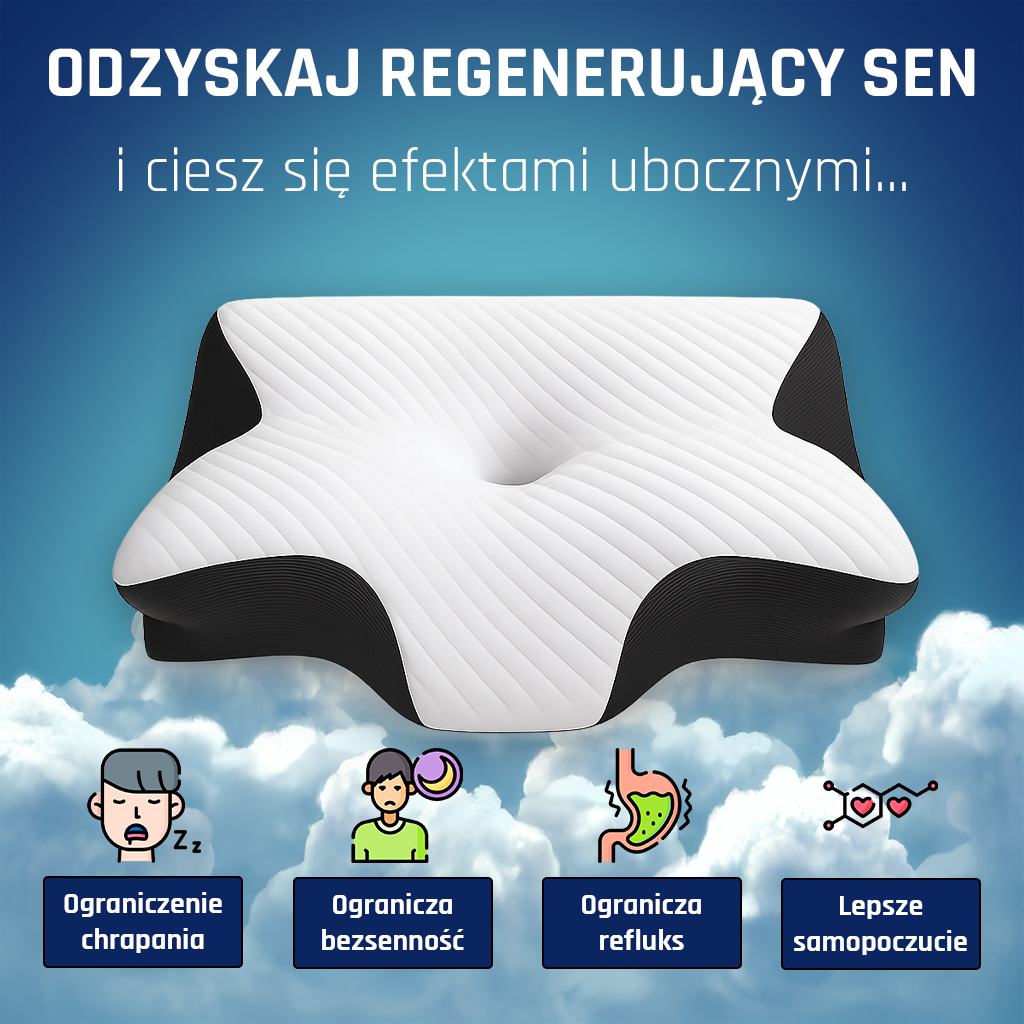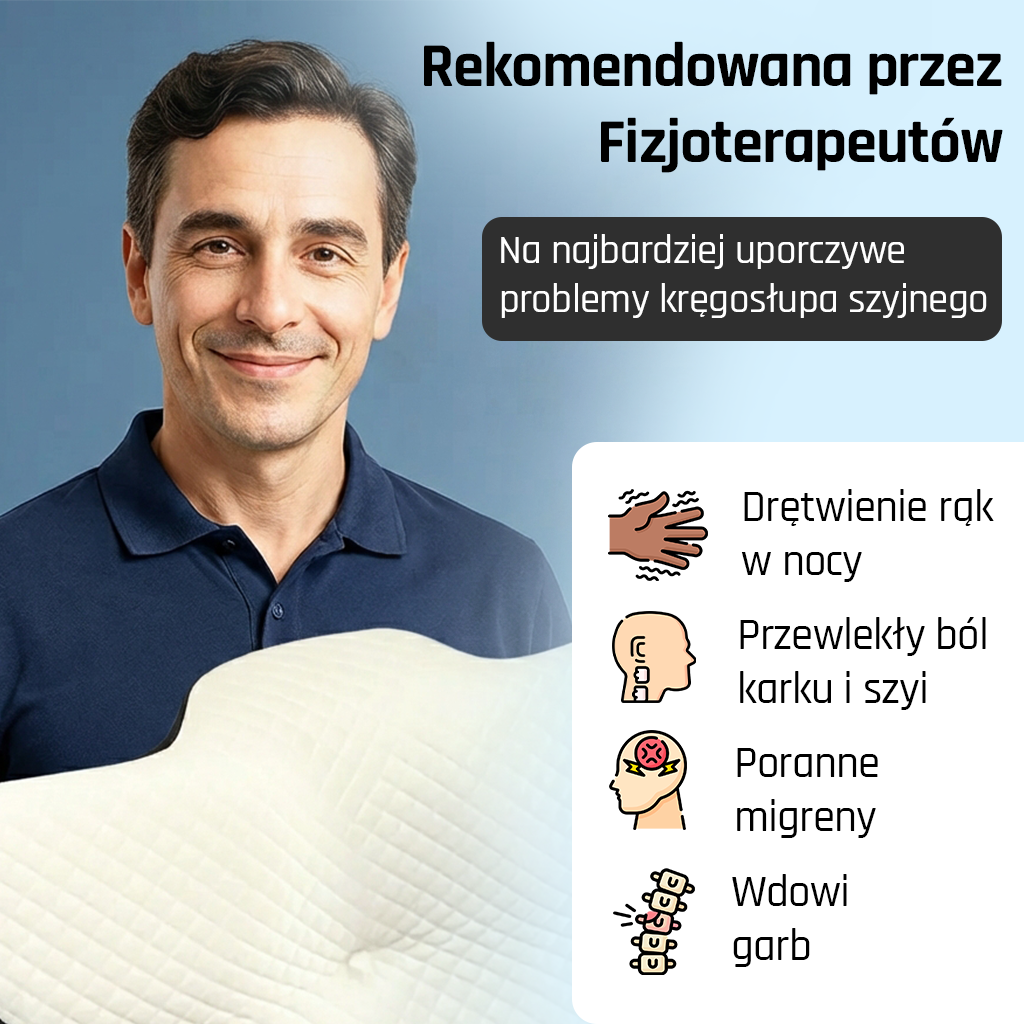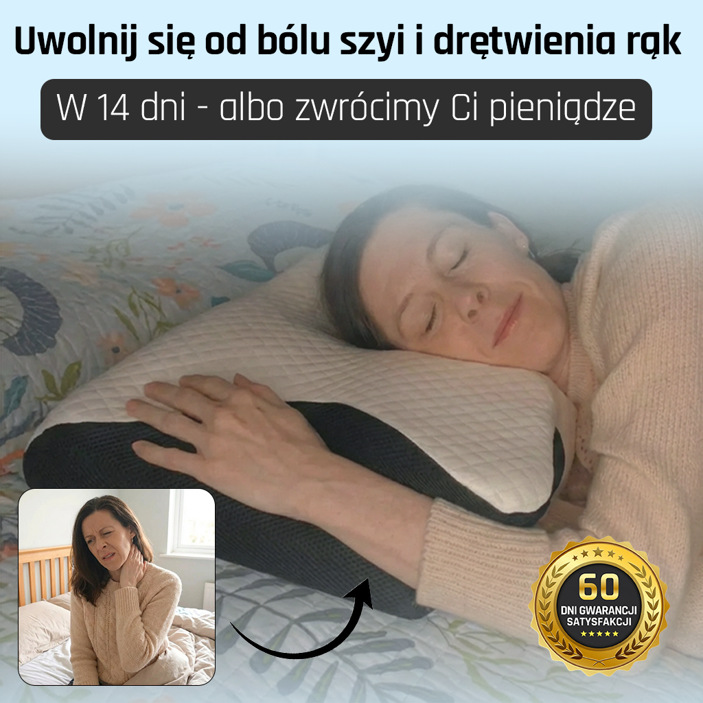 Budzisz się ze zdrętwiałą ręką, sztywnym karkiem, ciężką głową. Przetestowałeś już 5 „ortopedycznych” poduszek za 600+ zł, byłeś u neurologa który kazał robić drogie badania MR, brałeś tabletki przeciwbólowe – a nic się nie zmieniło. Wciąż ten sam ból, to samo zmęczenie, te same nocne wybudzenia.