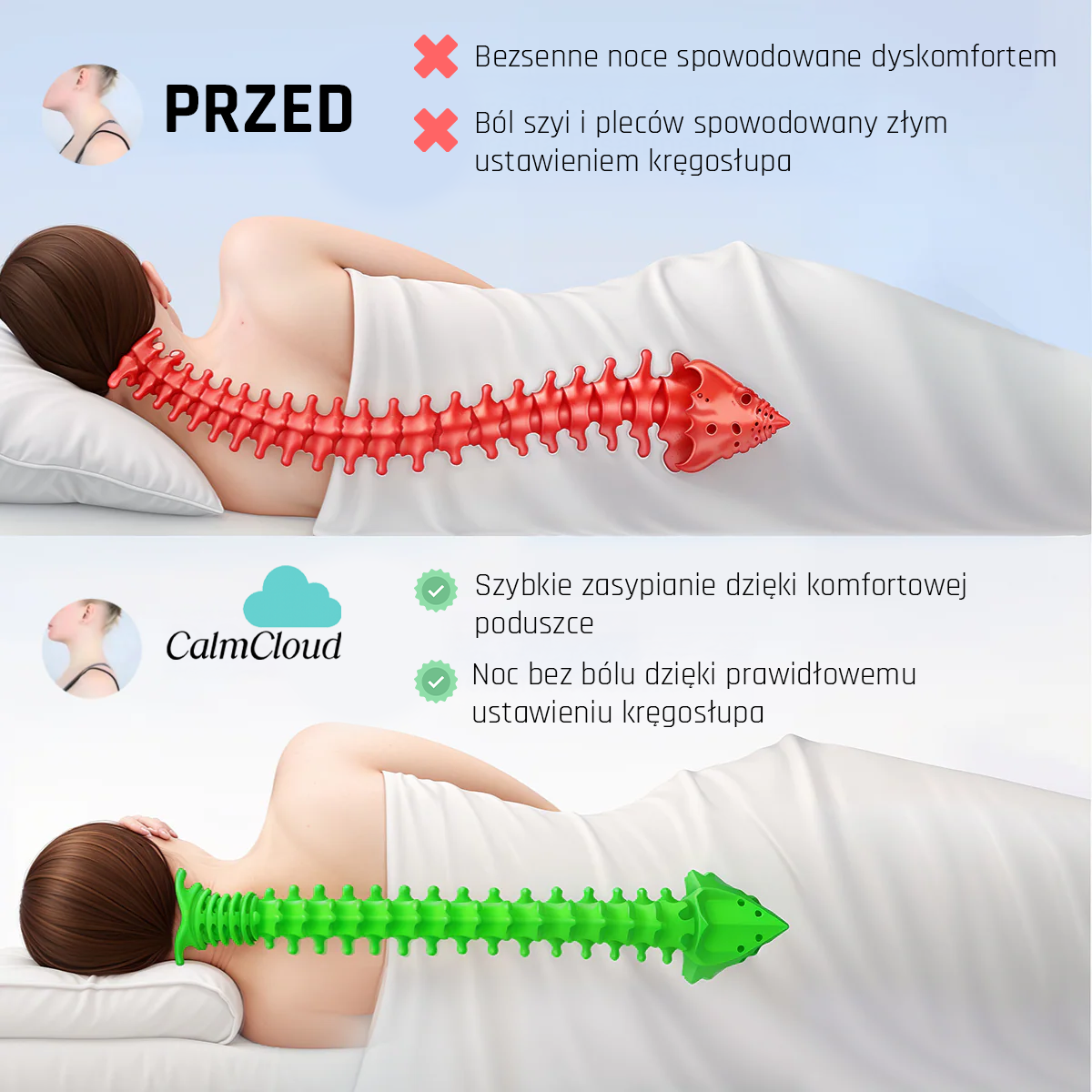 CalmCloud naturalnie wyrównuje głowę, kark i kręgosłup przez całą noc — bez wysiłku. Mniej napięć, lepsza postawa, więcej energii rano. Różnicę czujesz już po pierwszej nocy.