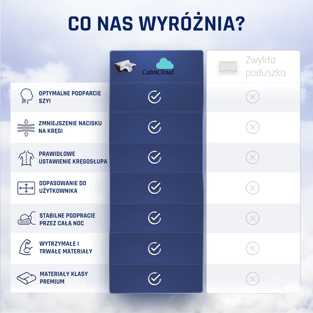 CalmCloud to ortopedyczna poduszka stworzona dla ludzi, którzy dość mają porannego bólu. Jej kształt utrzymuje szyję i kręgosłup w naturalnej pozycji przez całą noc – bez uciskania, bez napięcia. Rezultat? Wstajesz wypoczęty, nie zesztywniały.