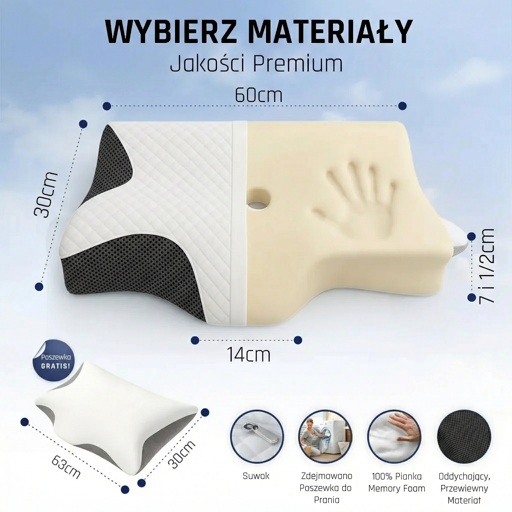 Ergonomiczny profil utrzymuje kark i odciąża barki – ciało się rozluźnia już w pierwszych minutach. Termoelastyczna pianka dopasowuje się idealnie, a oddychająca poszewka odprowadza ciepło.