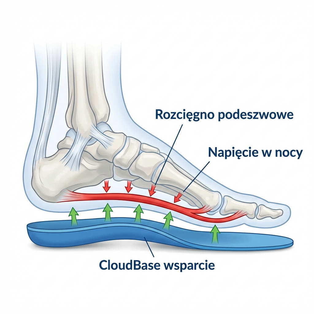 CloudBase utrzymuje stopę w pozycji lekkiego rozciągnięcia przez cały dzień. „Struna” nie ma szansy się napinać. Poranne bóle ustępują naturalnie.